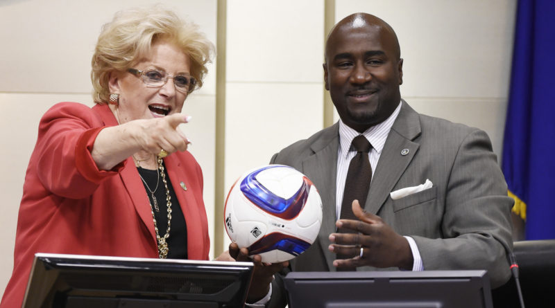 Mayor Carolyn Goodman and Councilman Ricki Barlow, whose district includes Cashman Field, celebrate minor league soccer coming to Las Vegas in 2018. Photo credit: Sam Morris/Las Vegas News Bureau
