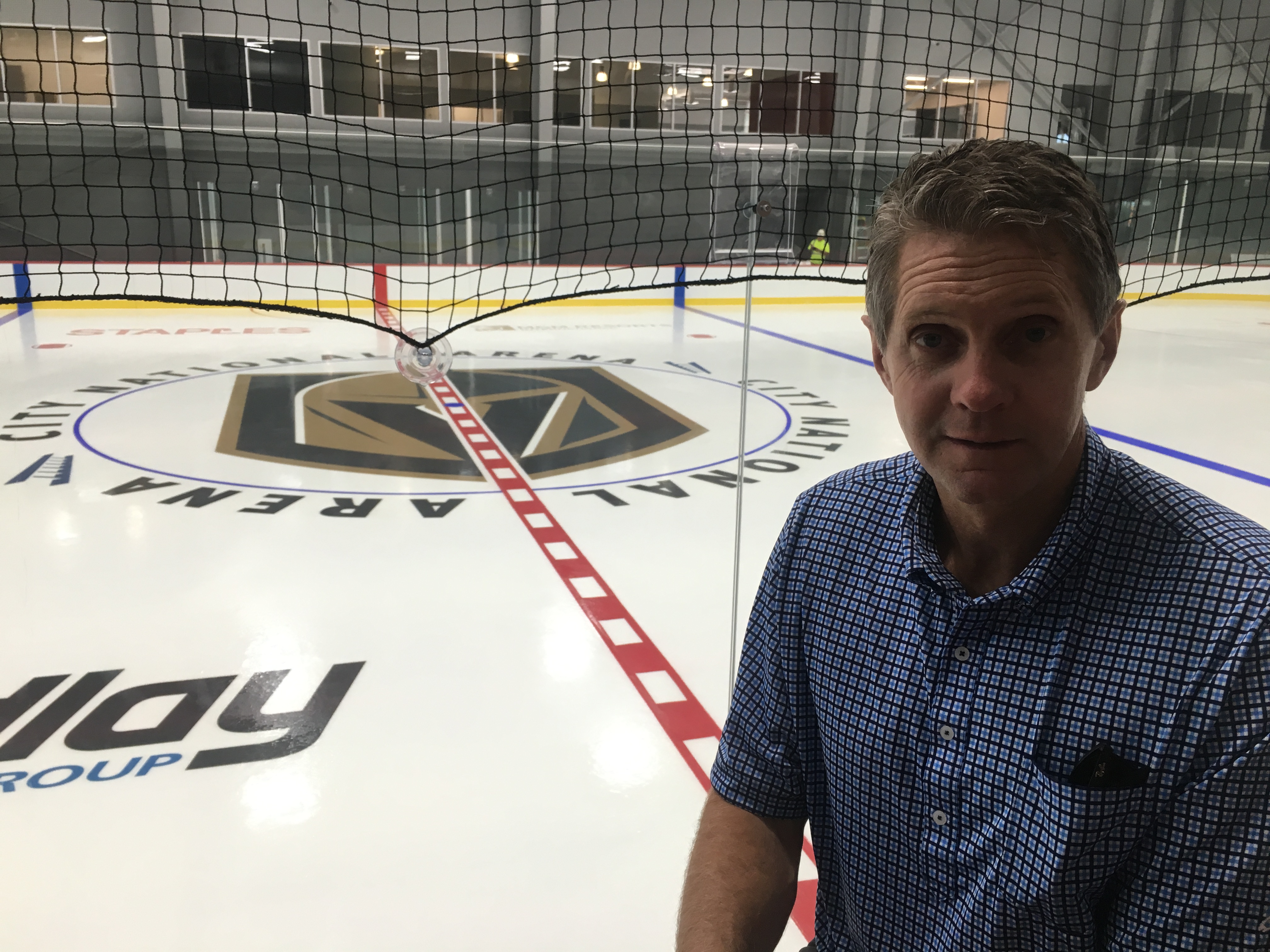 And the rink with the freshly applied sheet of ice already has its corporate sponsorship marks. The Golden Knights logo painted at center ice is surrounded by the City National Arena wording, with four other sponsor logos painted: Findlay Automotive Group, Foley Family Wines (that’s owner Bill Foley’s winery company), Staples and MGM Resorts International.