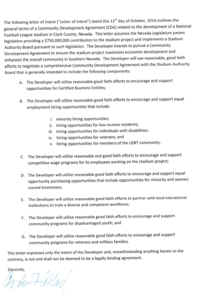 A letter of intent, signed by Adelson rep Andy Abboud, outlining the community benefits goals as part of the stadium deal.