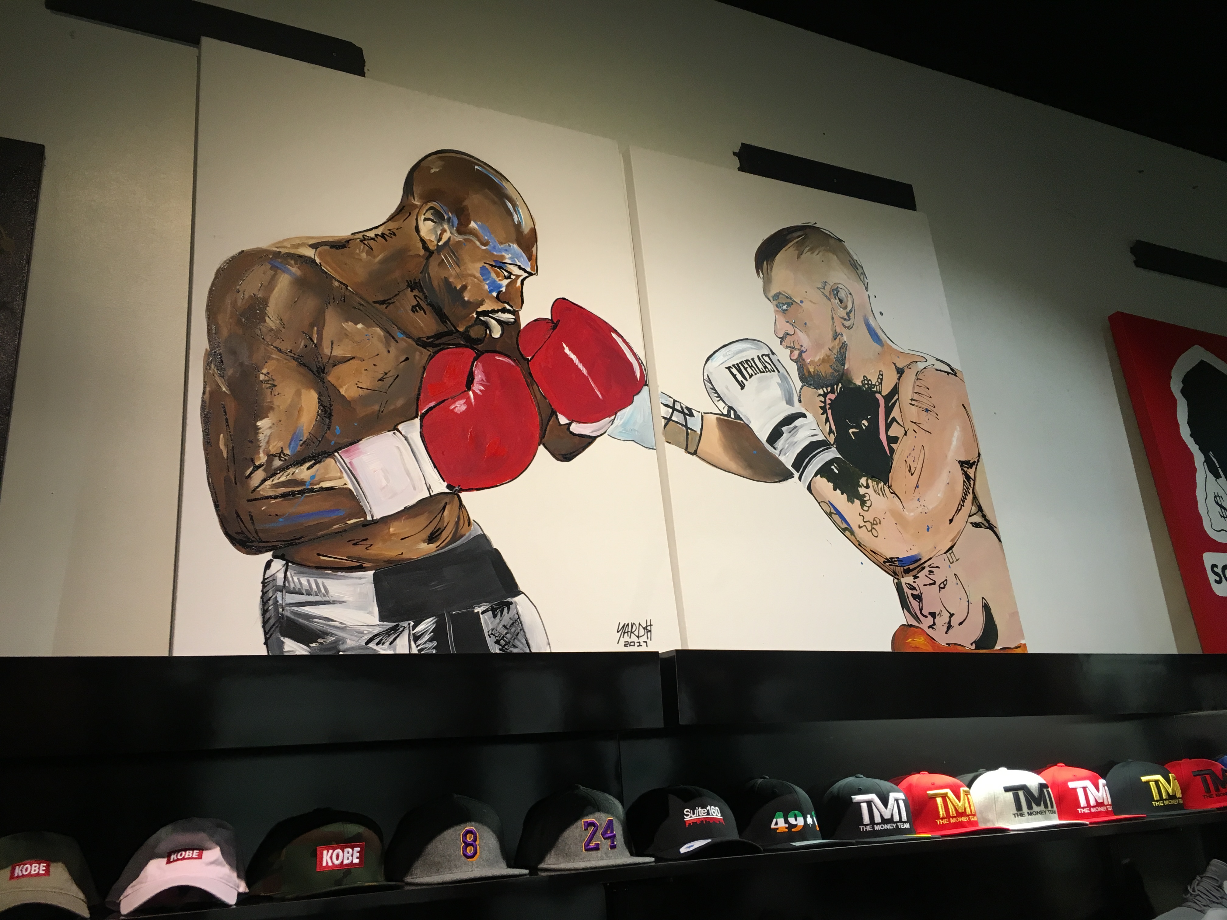 Check out this artwork of the two combatants that is selling for a cool $8,000 at Suite 160, a sneaker boutique/urban streetwear store at The Shoppes at Mandalay Place on the Strip not too far from T-Mobile Arena.