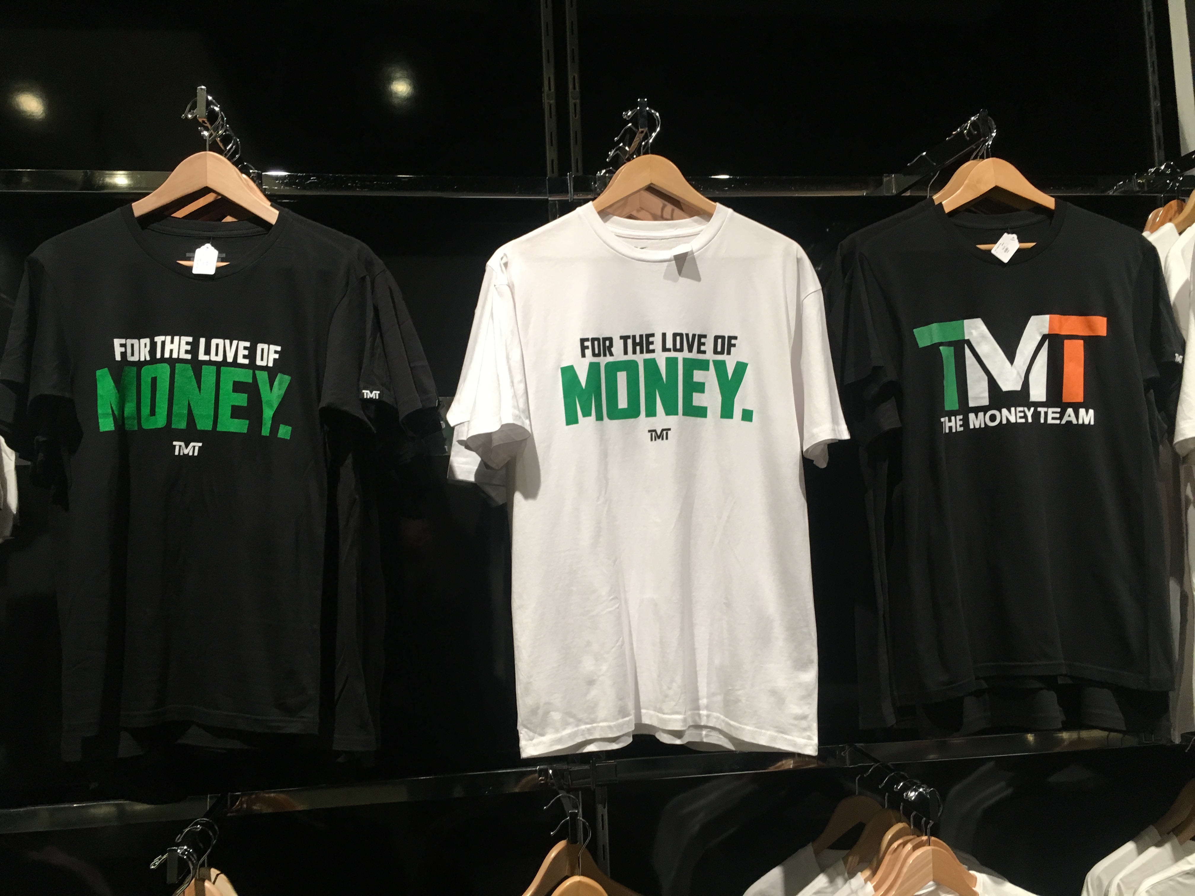 Store manager Areeba Moten said the store also sells the Floyd “Money” Mayweather ballcaps with the “TMT” logo for $40 and the T-shirts with the Money message sell for $38.