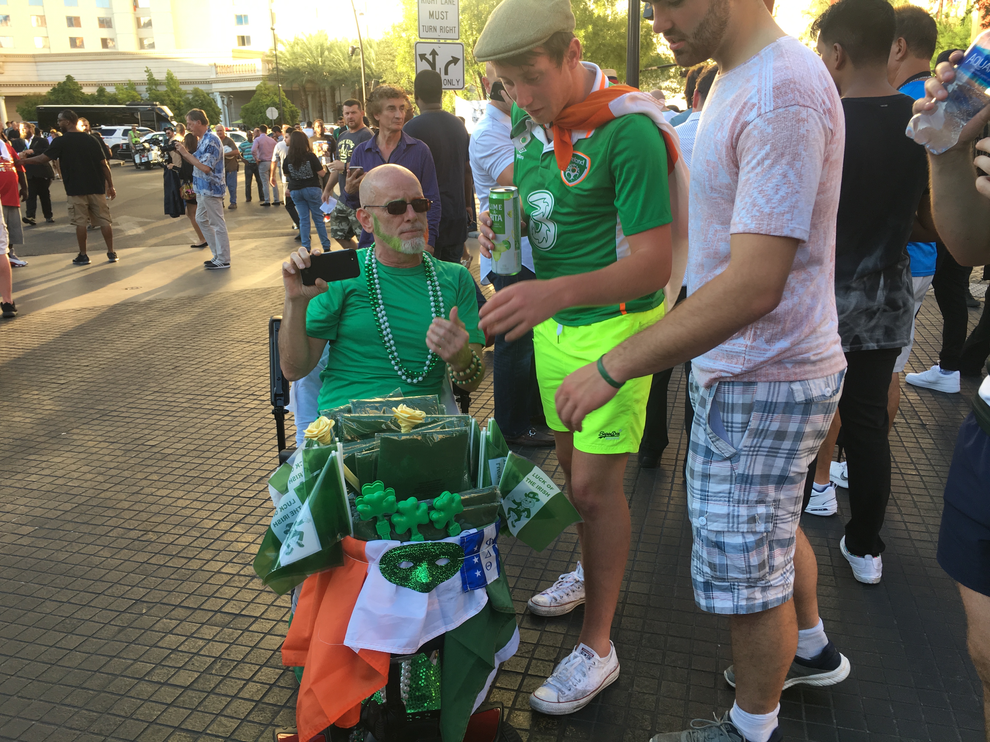 It was also a festive scene, where a McGregor fan arrived via scooter, while many others donned the Irish colors.