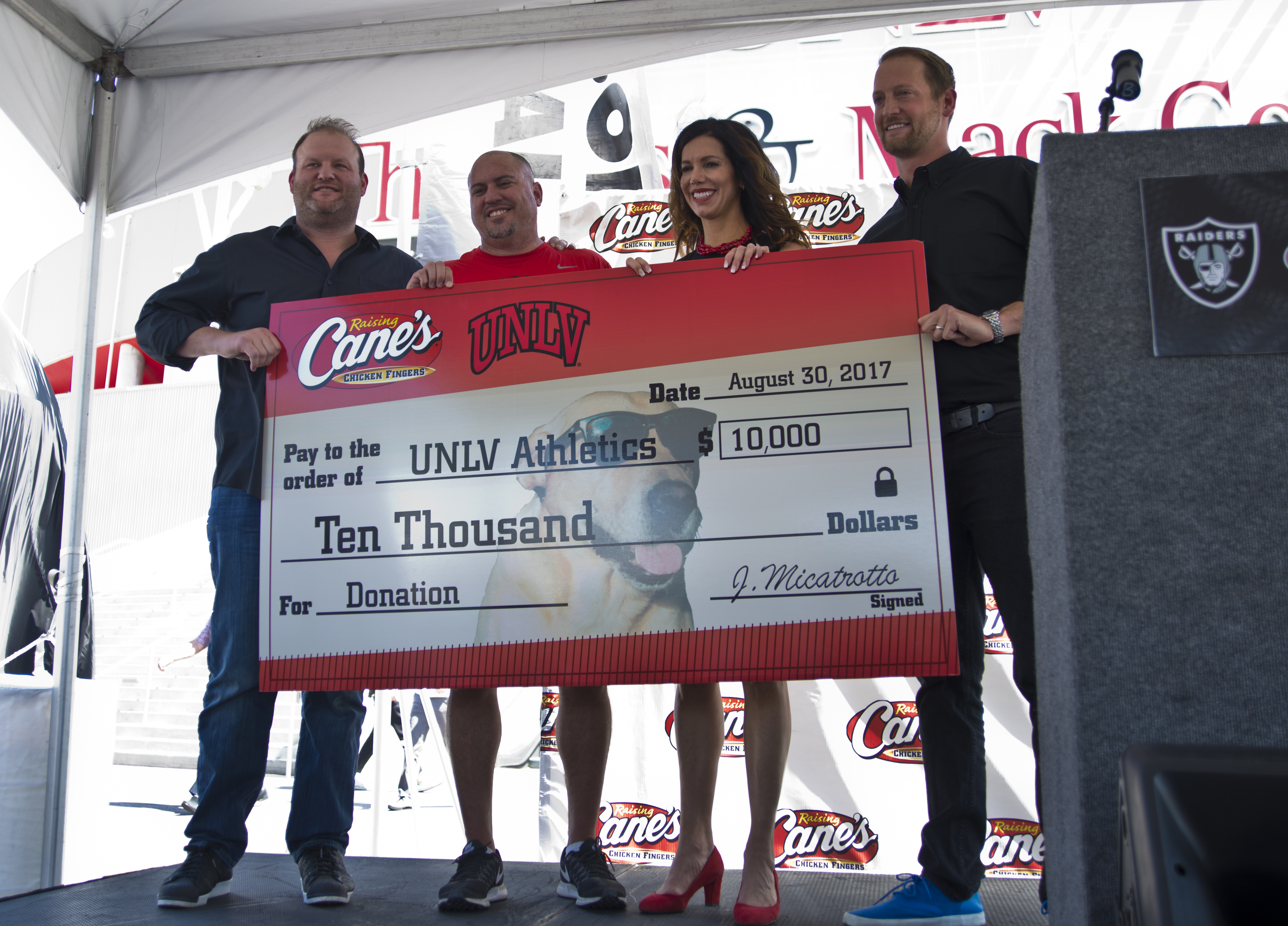 And when the Raising Cane’s chicken finger fast-food chain, a UNLV football team sponsor, gave a $10,000 check this week to UNLV sports, the new logo was nowhere to be seen on the check. Instead, the arched UNLV lettered logo was used.