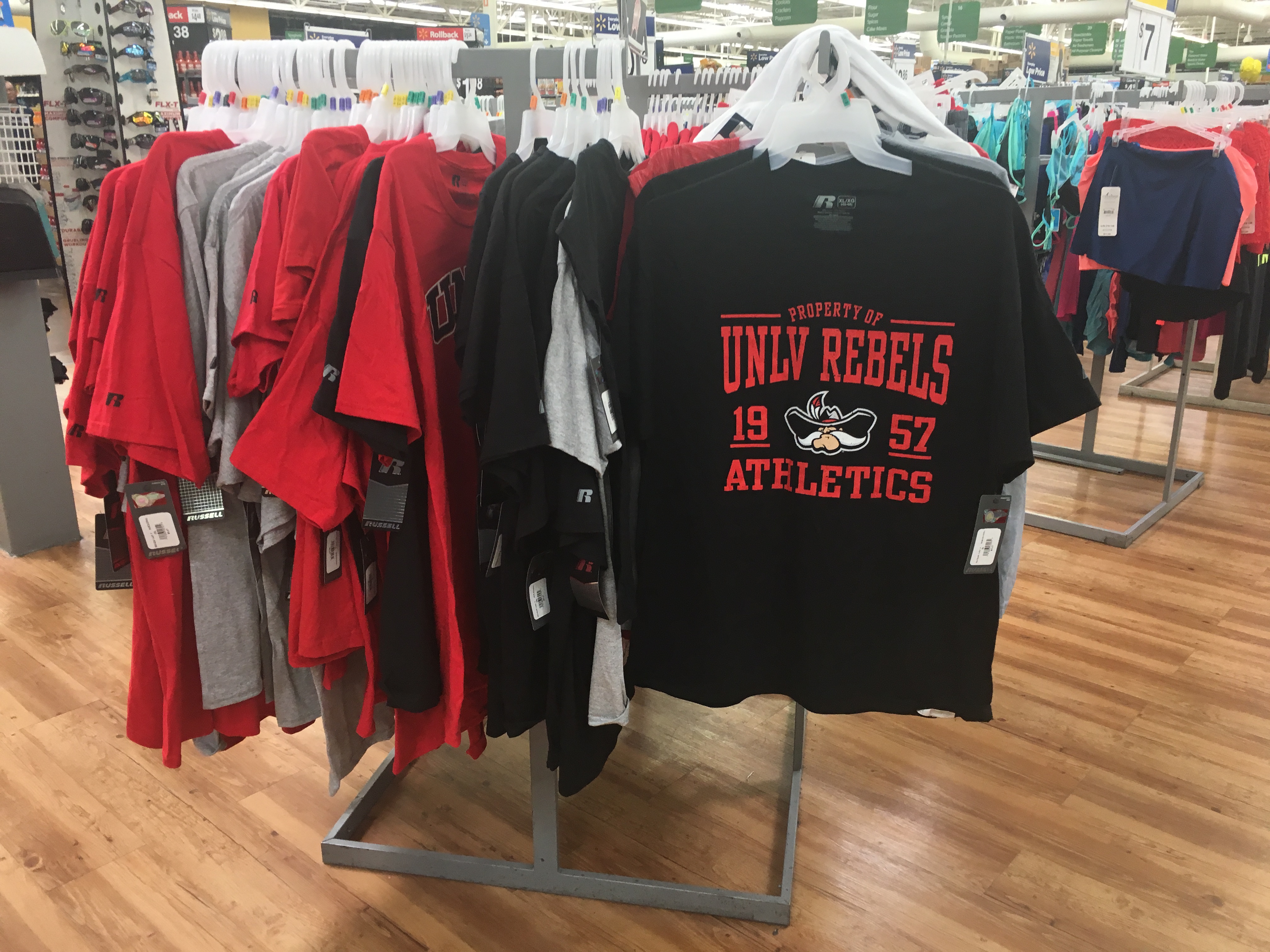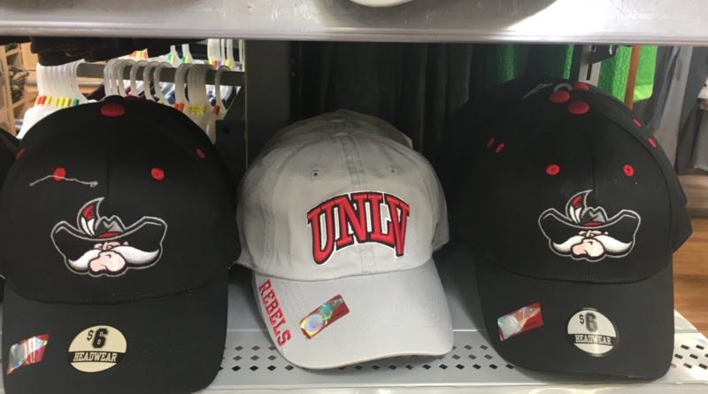 Despite all the university fanfare surrounding the “spirit logo” roll-out two months ago, campus sightings of UNLV gear with the new logo is scarce. Some garments displayed at the front of the UNLV Bookstore are imprinted with the redesign, but a majority of the shop’s apparel are marked with the UNLV arch, the UNLV crest or with phrases like “Rebel strong.”