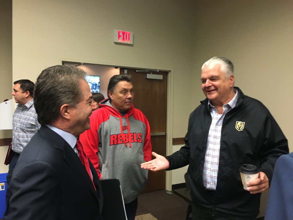 County Commissioner Steve Sisolak, wearing a Golden Knights jacket, talks with UNLV President Len Jessup (left) and stadium board member Tommy White (center).
