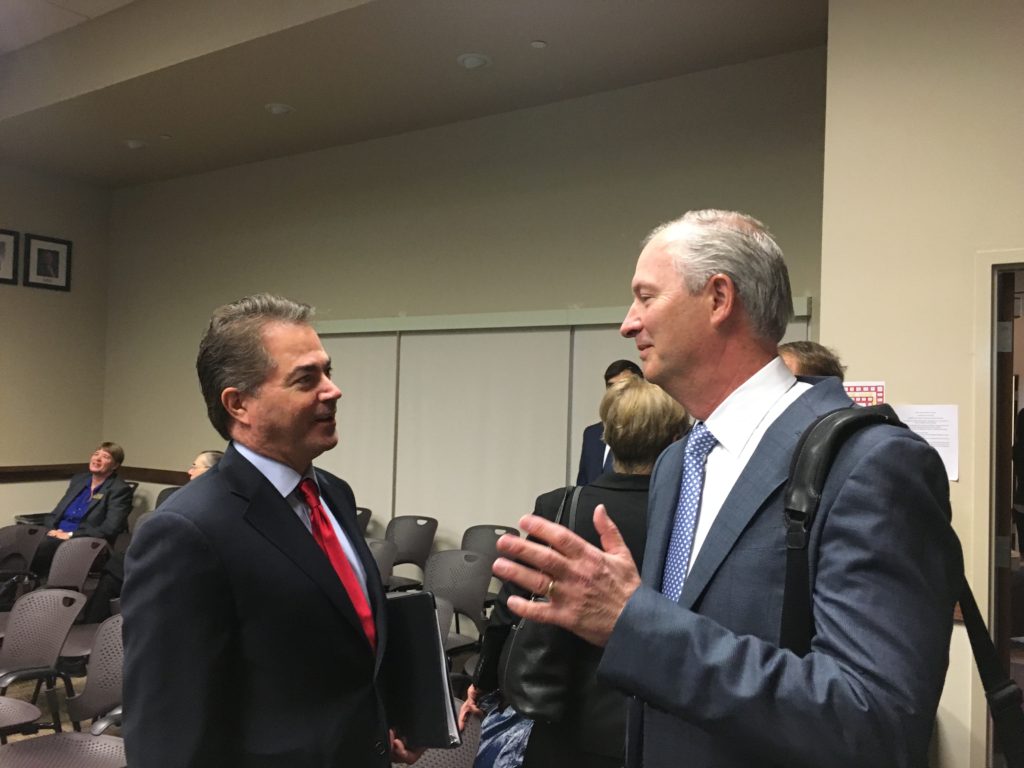 Stadium board chairman Steve Hill (right) chatting with UNLV President Len Jessup (right) before Raiders-UNLV joint-use agreement meeting today.