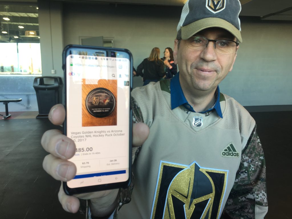 A puck purchased at the store at the Golden Knights’ Oct. 10 home-opener is going for $485 on eBay — and Roy predicts it will eventually sell for $600.