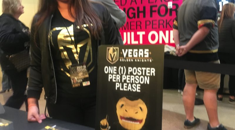 A young woman monitoring the poster table in the lobby before Tuesday night’s Golden Knights-Columbus Blue Jackets said she was told to be there because fans are snagging too many posters.