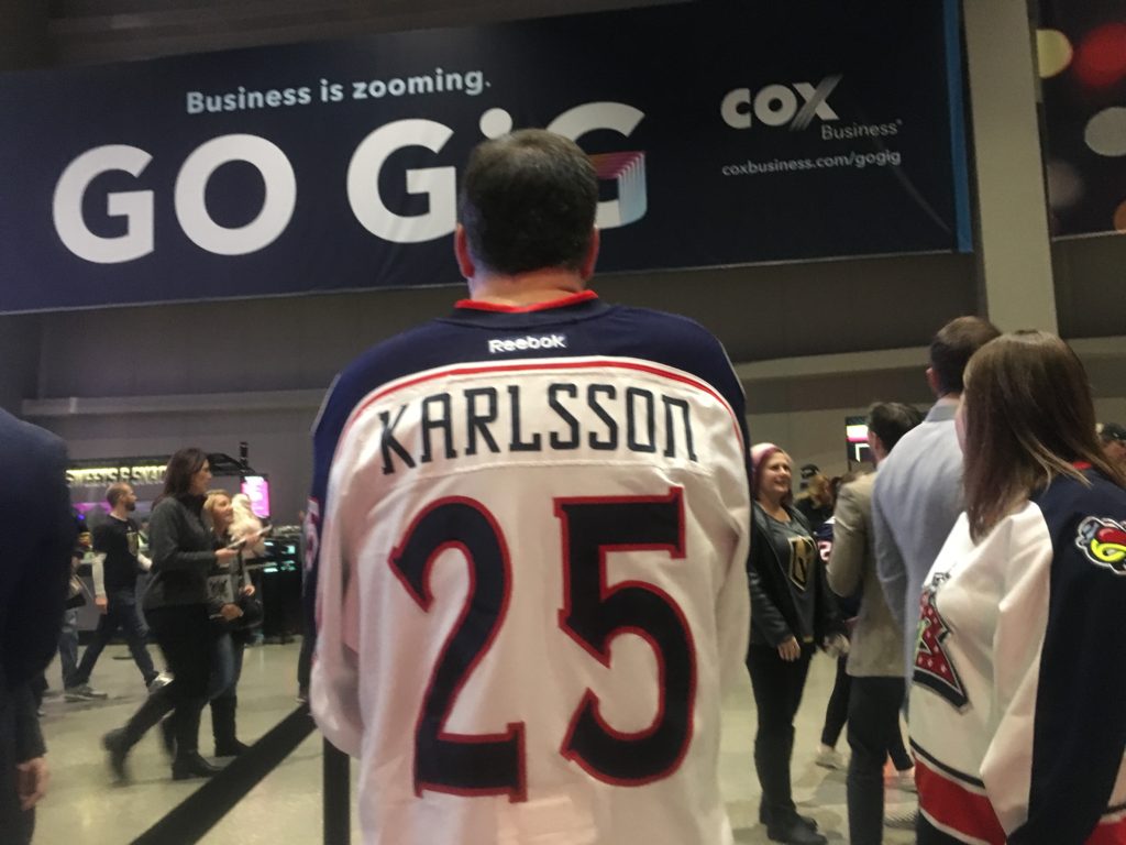 Tonight’s poster features William Karlsson, a former Blue Jacket player who scored his 26th and 27th goals off the season against his former mates. The Knights defeated the Blue Jackets, 6-3, in front of 18,231 fans — the second biggest crowd of the season.