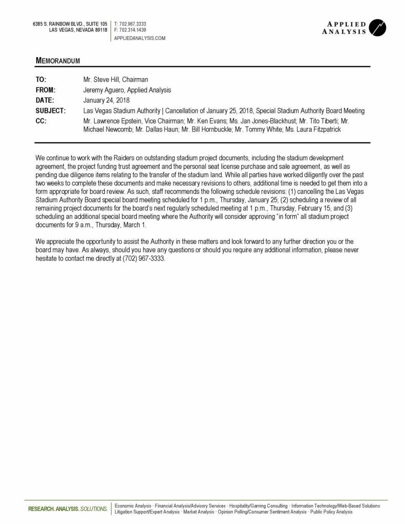 Stadium board consultant Jeremy Aguero of Applied Analysis wrote to board chairman Steve Hill and members that more time is needed by the Raiders and stadium board staff to finish documents related to a final Raiders stadium development and personal seat license agreements.