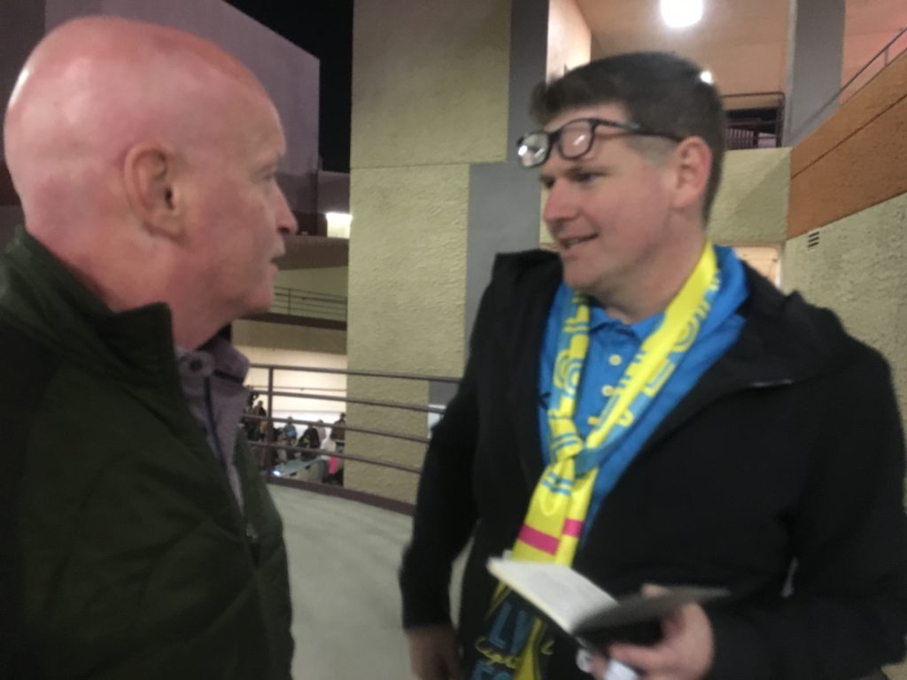 Patrick Hughes, president of the Fremont Street Experience, told LVSportsBiz.com that the crowd flowing into the stadium was “galvanizing the city.” He shook Lashbrook’s hand and they shared laughs before the game.