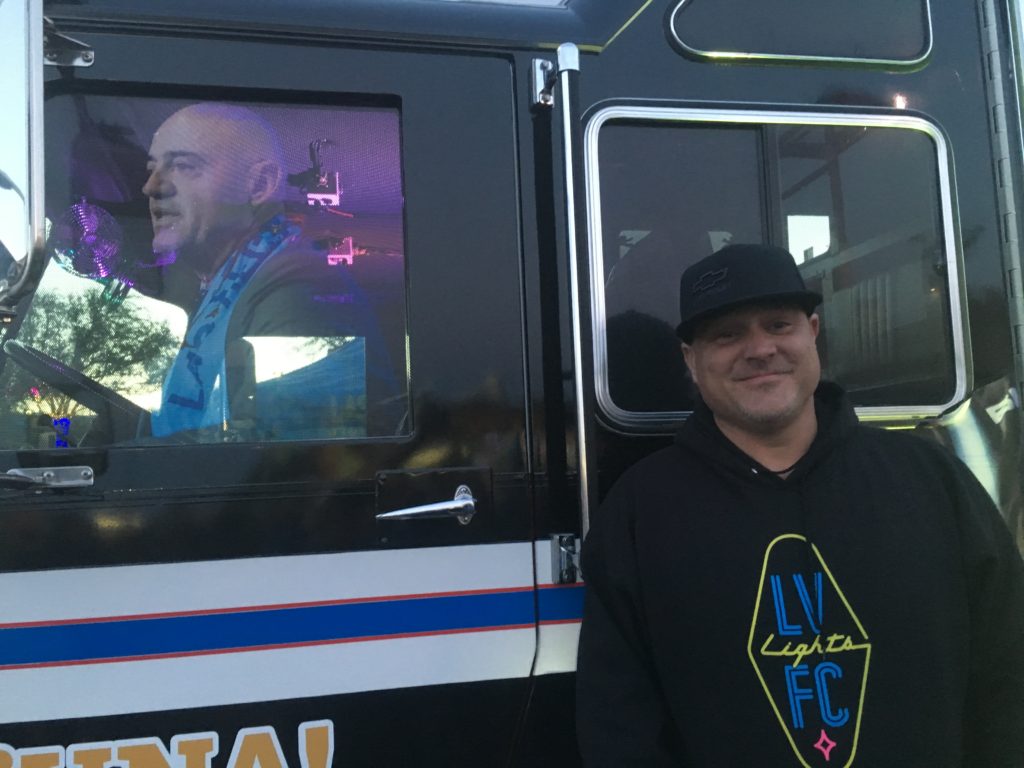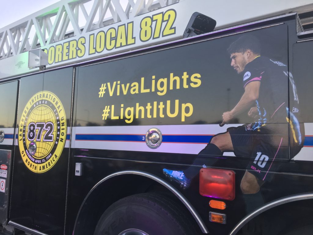 Laborers 872’s presence is also outside Cashman Field, where a firetruck with 872 union and Lights club logos adorn the rig. 872 member Lou DeSalvio drives the firetruck (and the union’s Raiders bus.) He has a special license to drive both the Lights firetruck and Raiders bus.