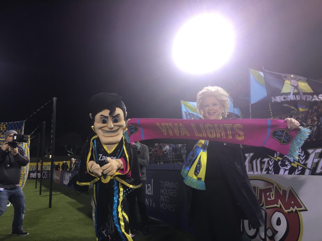The Lights unveiled their new mascot, Cash the Soccer Rocker, while Mayor Carolyn Goodman received the franchise’s first-ever “Pink Scarf” for her work in bringing professional soccer to downtown Las Vegas.
