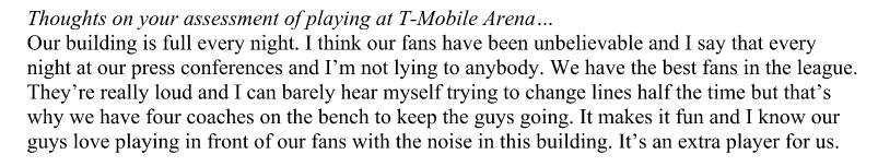 LVSportsBiz.com asked Gallant a few days earlier about the impact of playing in this ice house and here’s what the man called Turk told the media.