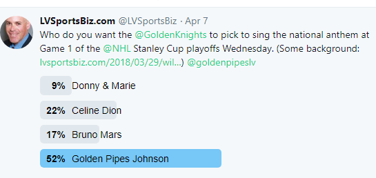 Two weeks ago, LVSportsBiz.com raised the specter of the 36-year-old Johnson serving as the team’s go-to anthem singer in much the same way the Boston Bruins enlisted iconic singer Rene Rancourt who is retiring after 42 years of singing the national anthem in Boston.