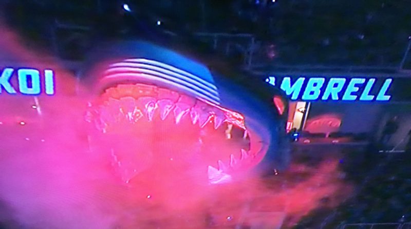 If you enjoy the Vegas Golden Knights’ playoff pre-game rite of the descending 20-foot-tall knight’s helmet prop at T-Mobile Arena, know that the San Jose Sharks have been dropping the giant shark head to the ice surface for years.