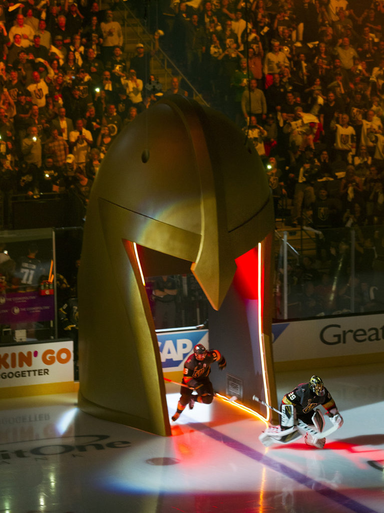 The Golden Knights have a worker with San Jose Sharks experience, so the VGK could rely on some experience on dropping a giant prop from the T-Mobile Arena rafters. A Henderson water construction and prop fabrication company created the giant knight’s helmet prop.