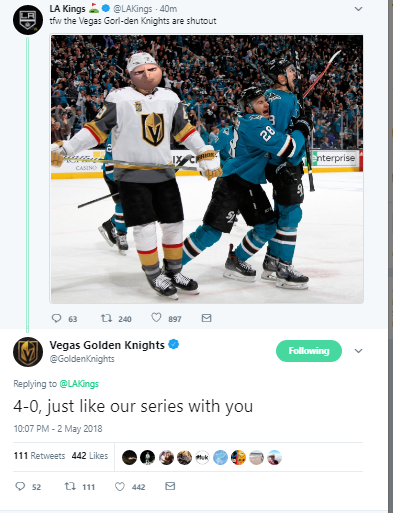 And we leave you with this Golden Knights tweet to the Los Angeles Kings after the VGK’s 4-0 loss to the Sharks.