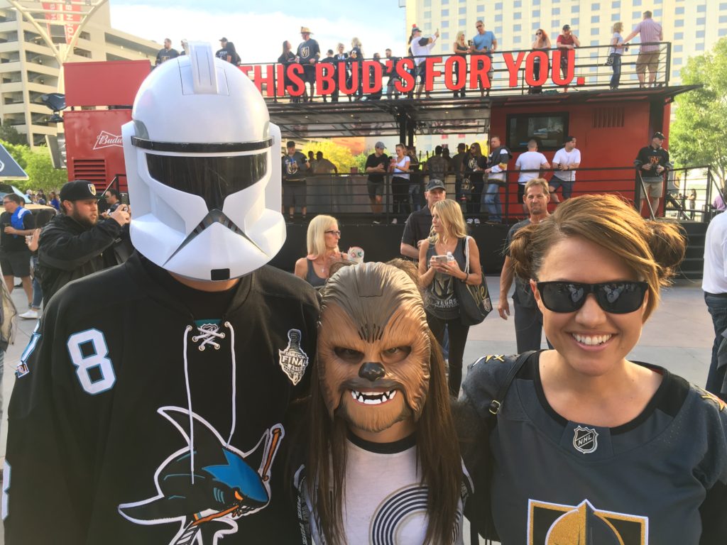 I met mom Shannon Baca, wearing a Golden Knights jersey; her son, Jacob, 16, wearing a San Jose Sharks jersey; and her daughter, Brianna, 12, who said she was “confused” and didn’t know who to root for.