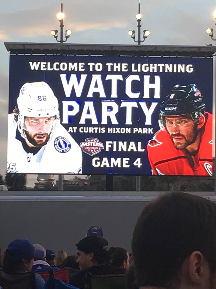 Tampa held its watch parties, too. Hockey mom Paula Flores of Tampa posted these photos on a watch party at a local city park where hundreds of Lightning fans watched the Lightning defeat the Washington Capitals Thursday night and tied the Eastern Conference Finals at two games apiece.
