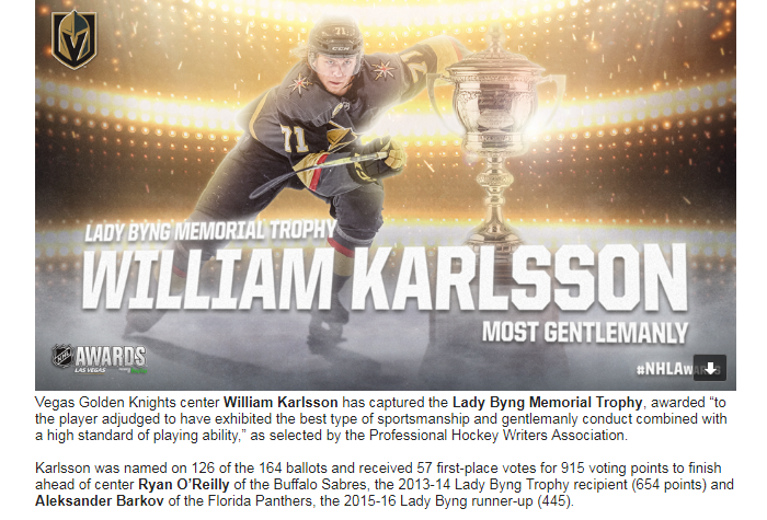 And when Golden Knights star forward William Karlsson won the Lady Byng Memorial Award for the league’s best player combining sportsmanship and playing ability, he thanked a host of people including the Oct. 1 first responders.