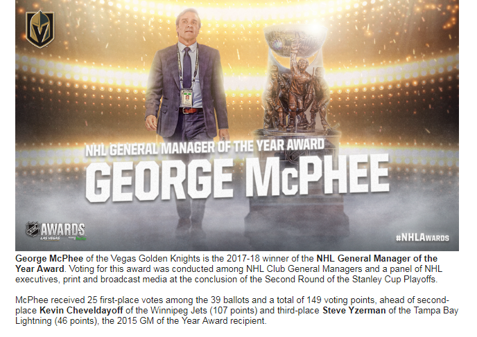 And after Karlsson, Gallant and Engelland scored league honors, VGK General Manager George McPhee took home the honor for the NHL’s best general manager in 2018.