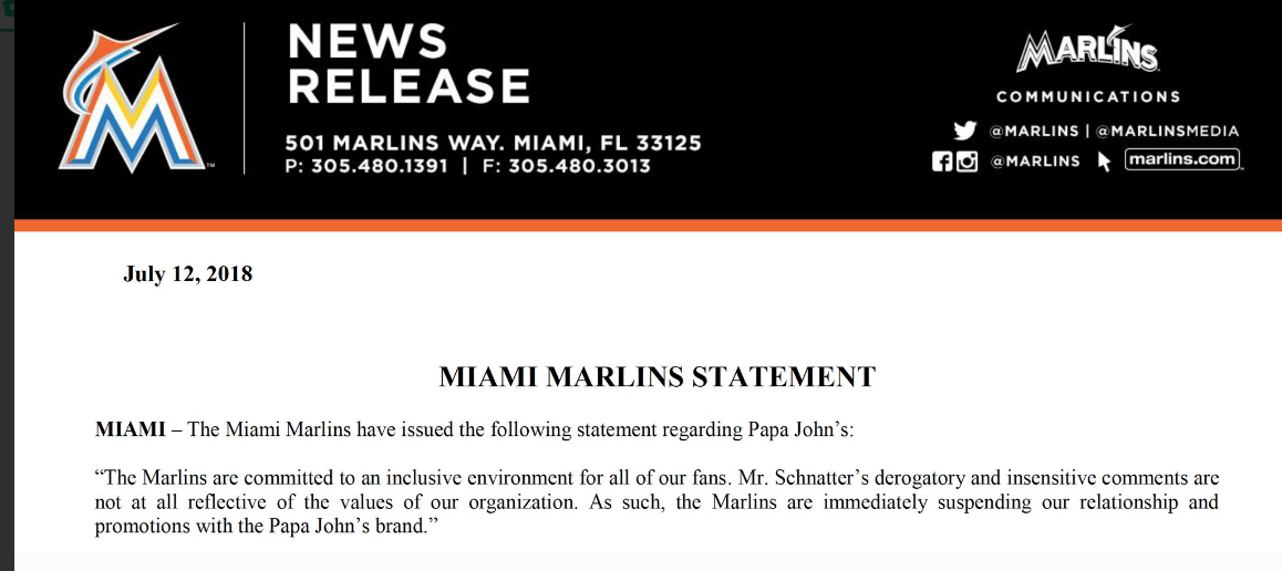 Teams and colleges have distanced themselves from Papa John’s pizza founder John Schnatter, who admitted using a racial slur during a conference call. The Miami Marlins issued this statement to explain why it suspended its business relationship with the Papa John’s brand..