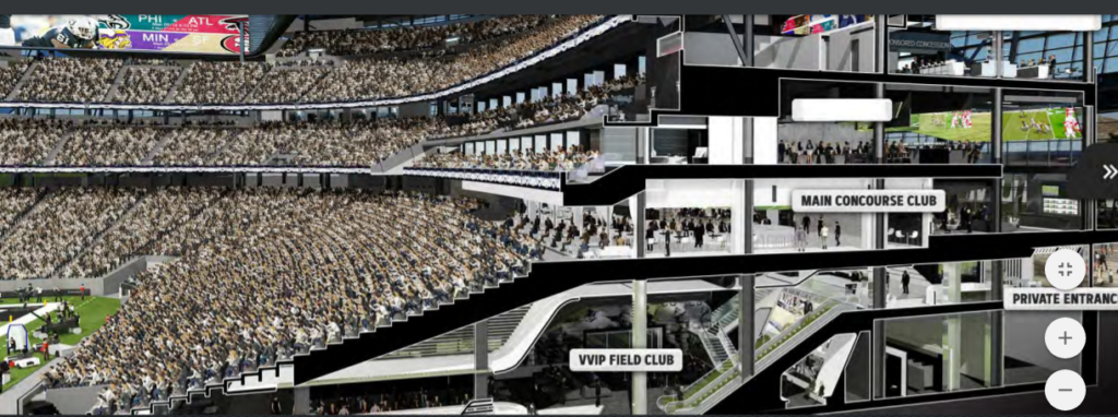 Here’s a look at the Raiders stadium club sections. The $1.8 billion domed stadium is scheduled to open in summer 2020 for the Raiders and UNLV football team. Legends Global Sales has been enlisted by the Raiders for the personal seat license and ticket sales.