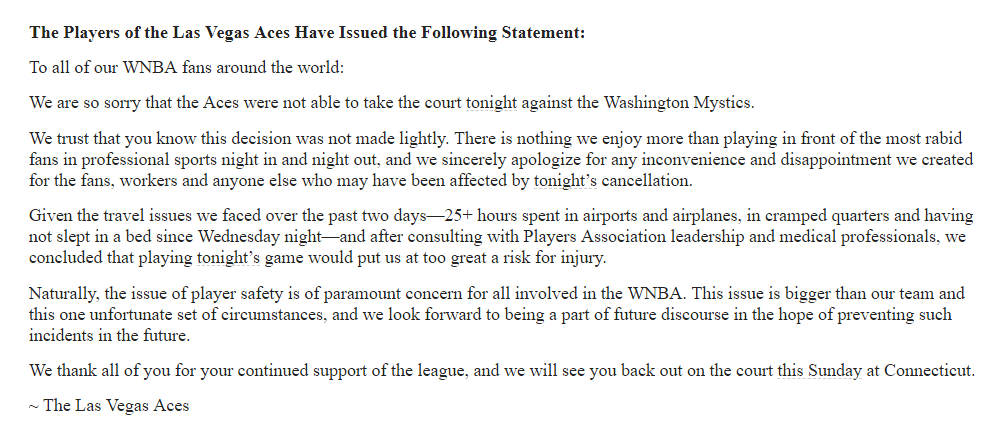 “Given the travel issues we faced over the past two days—25+ hours spent in airports and airplanes, in cramped quarters and having not slept in a bed since Wednesday night—and after consulting with Players Association leadership and medical professionals, we concluded that playing tonight’s game would put us at too great a risk for injury,” the Aces players said in the statement.