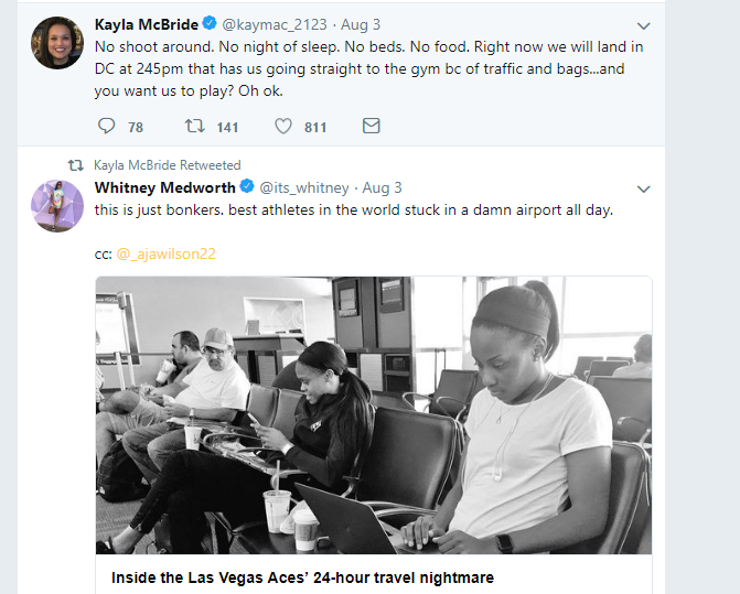 The Aces’ All-Star shooting guard, Kayla McBride, tweeted about the travel mess.