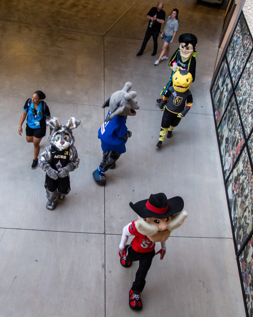 He’s the veteran of the bunch, chatting with the fellas who play Cosmo for the 51s, Bucket$ for the Aces, Hey Reb for UNLV and Cash the Soccer Rocker.