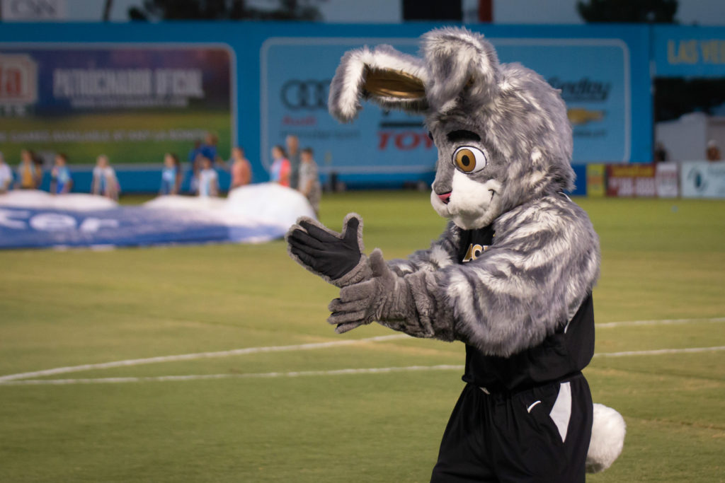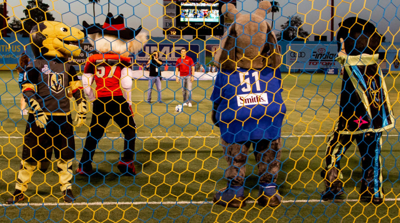 It’s the second half and the hometown Lights would win this United Soccer League game, 1-0. But inside the air conditioned environs of Cashman’s press box lunch room, which is mostly rectangle-shaped tables and chairs, five dudes with gigantic duffle bags stuffed with mascot costumes are talking shop.