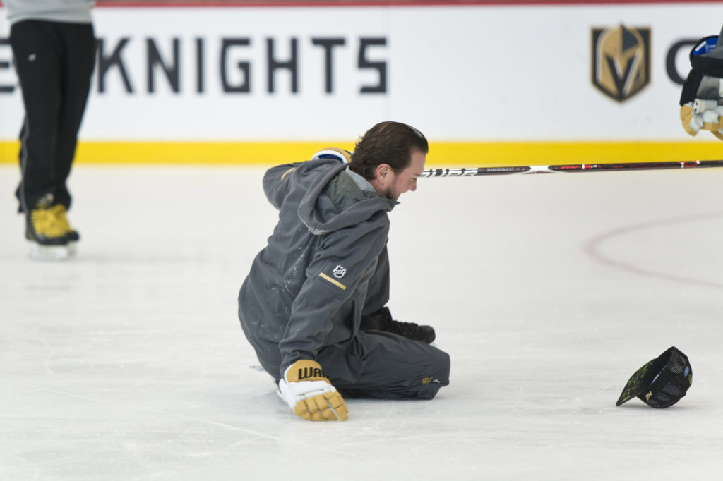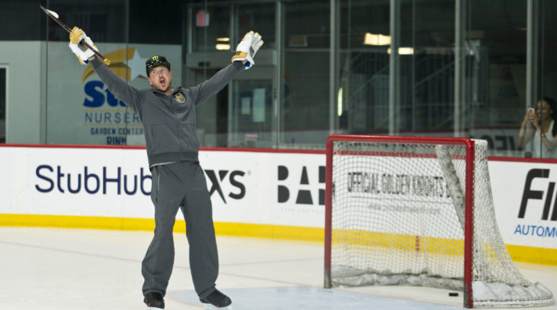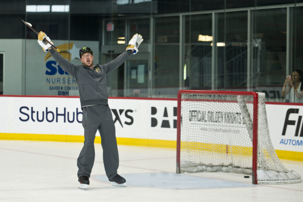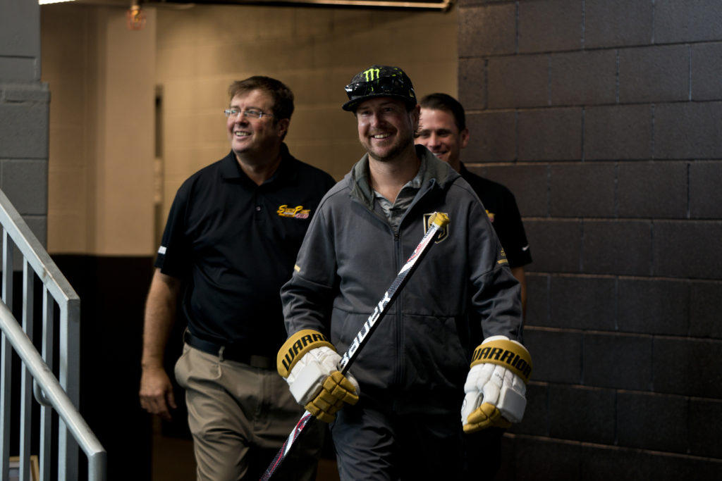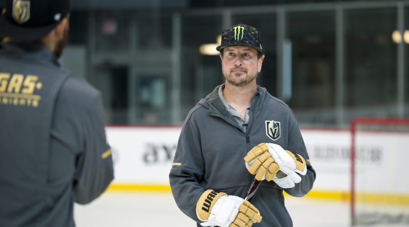 Engelland and Hnidy tutored Busch on the finer points of slap shots and skating at the Knights’ training center in Summerlin.