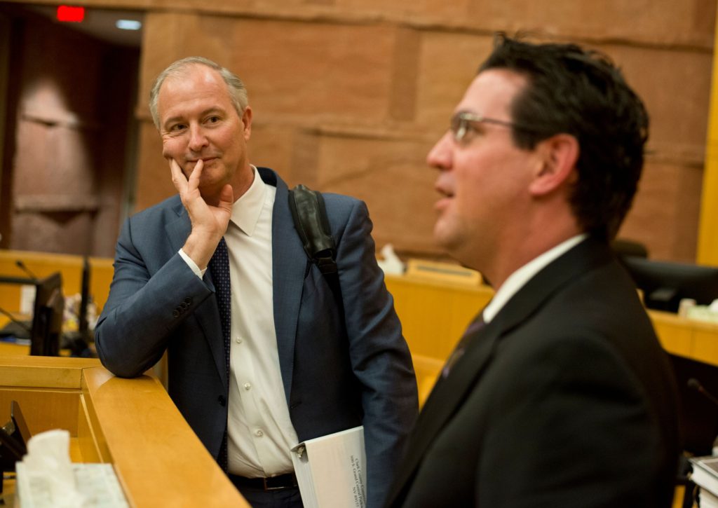 Stadium board chairman Steve Hill listens to Jeremy Aguero after a stadium board meeting. Photo credit: Daniel Clark/LVSportsBiz.com