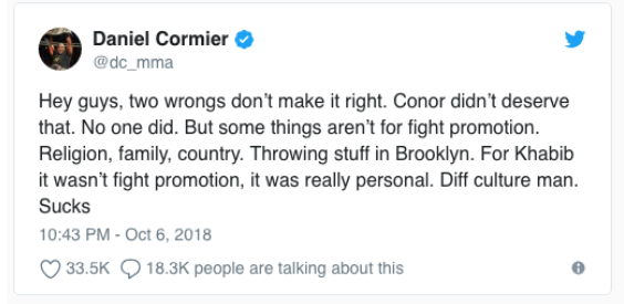 For Nurmagomedov, religion and country are not smack — or “mean talk,” as UFC ringmaster White put it. We can’t pretend that making incendiary statements don’t have consequences. These words and type of behavior can prove deadly where he comes from. As Cormier put it in his tweet, “Diff culture man.”