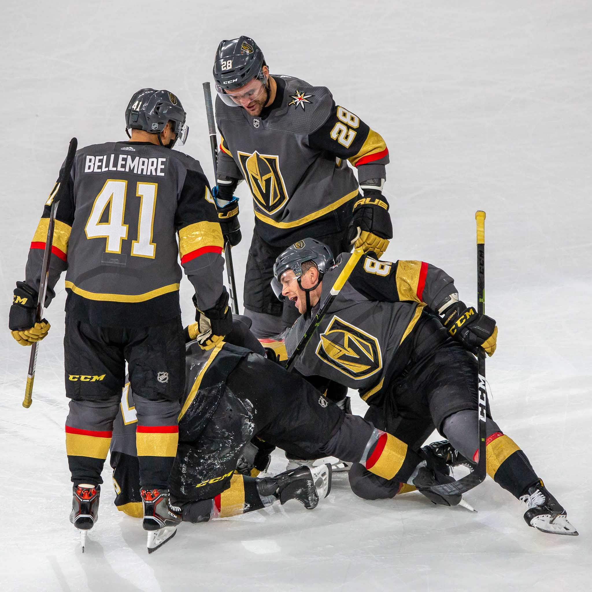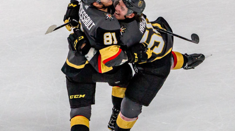 Jonathan Marchessault and Erik Haula celebrate Marchessault's penalty shot score to defeat Ottawa in OT, 4-3.