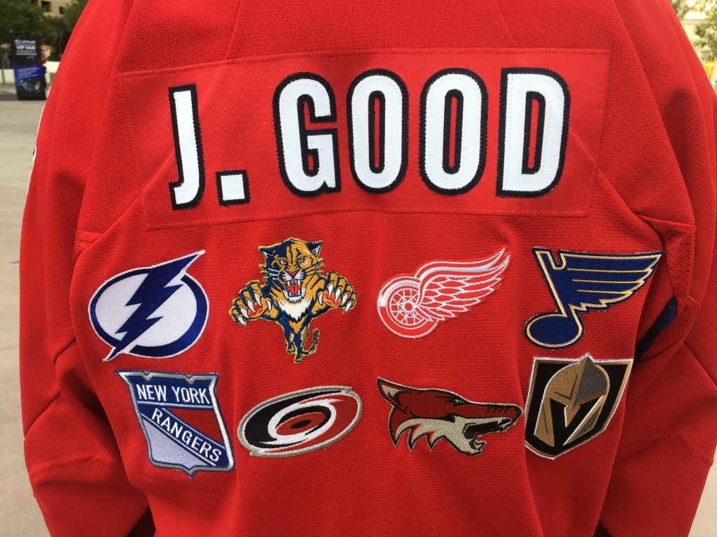 The married couple is in Las Vegas for the SEMA car show and the duo added T-Mobile Arena and the Vegas Golden Knights to their Bucket List quest of visiting every arena in the National Hockey League. T-Mobile Arena is the eighth venue visited on their list. Justin, 38, and Nikki, 42, wear Good’s Arena Tour jerseys and add team patches to the back of the jerseys every time they visit a NHL arena.