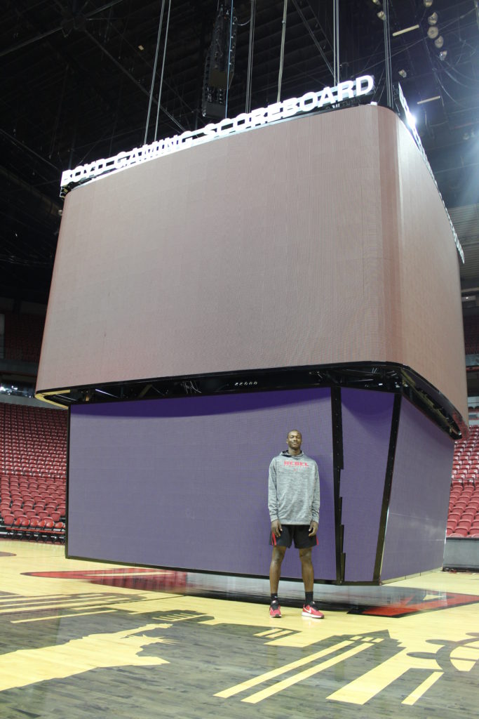 Mike Newcomb, Thomas & Mack Center’s executive director, supplied LVSportsBiz.com with the video board photos. That’s 6-foot-11-inch junior forward Cheickna Dembele standing in front of the scoreboard.