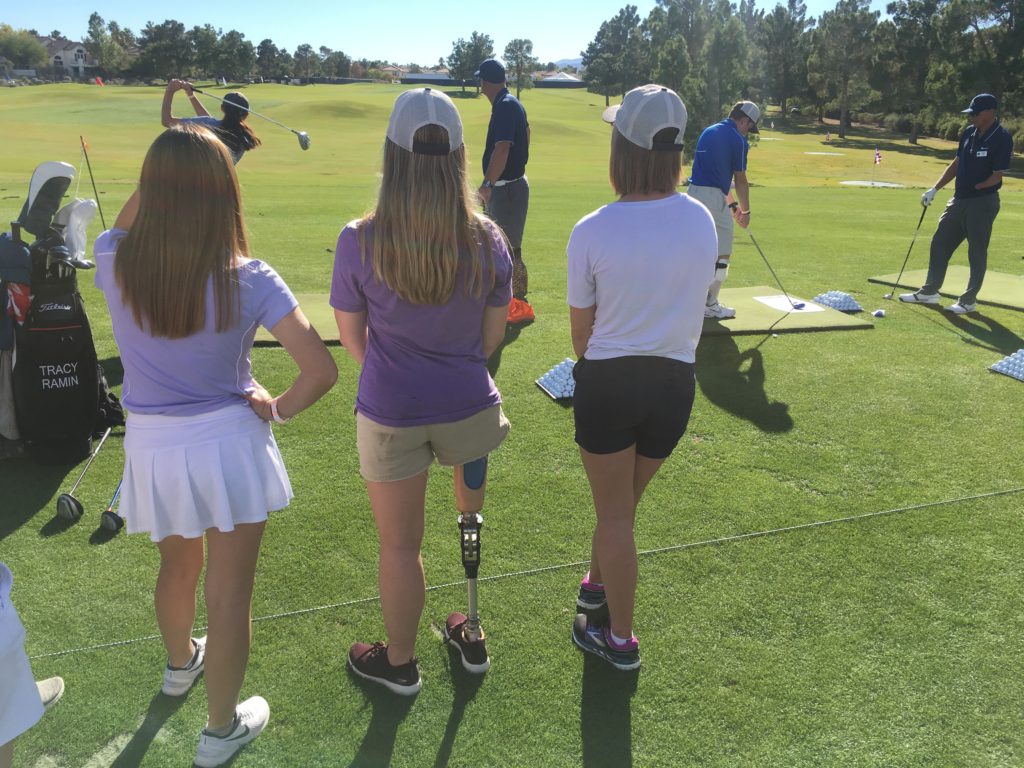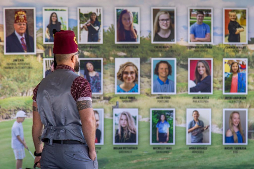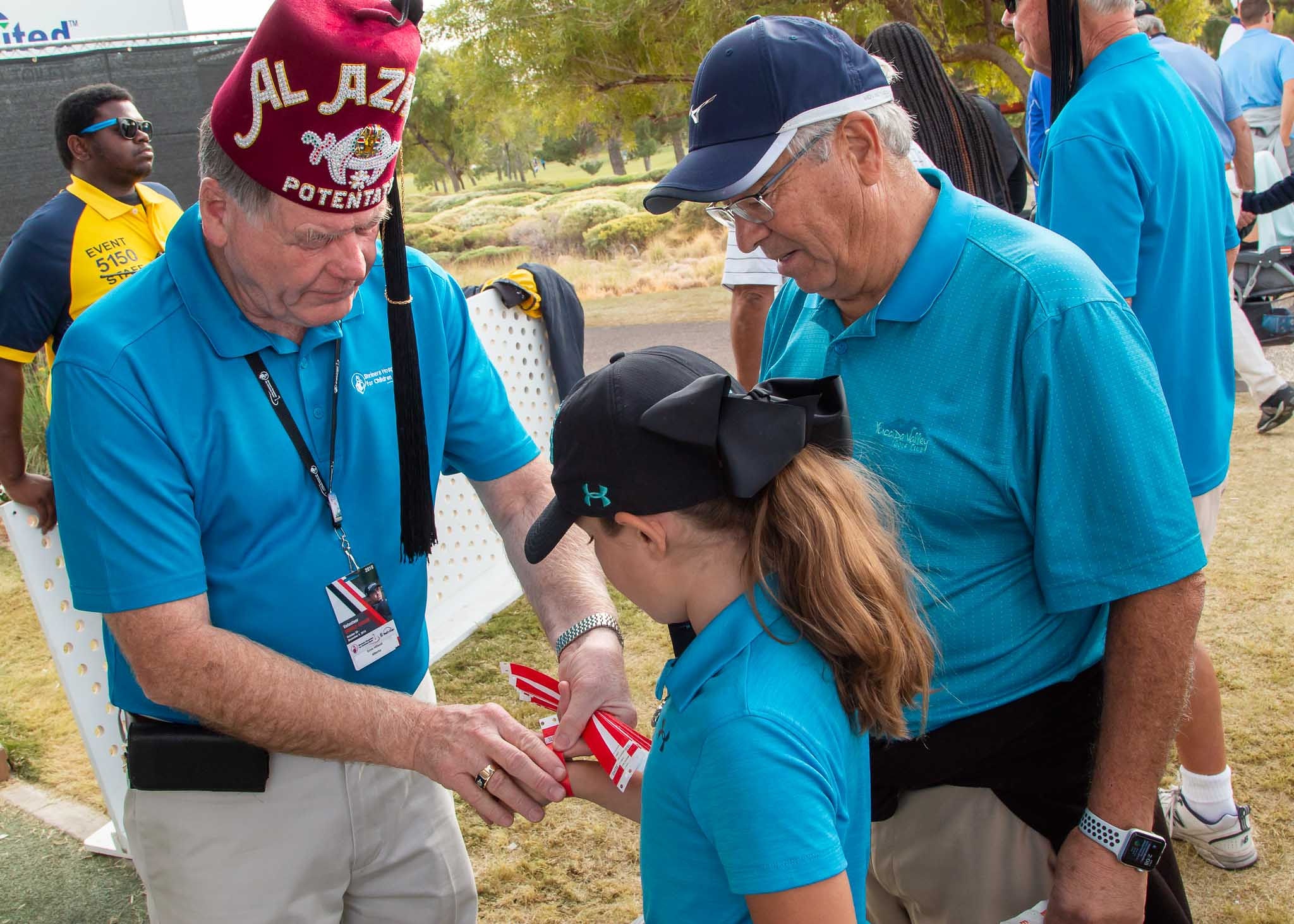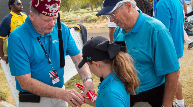 The tournament has placed a bigger emphasis on showcasing kids who receive Shriners hospital treatment and held an adaptive golf clinic to connect para-golfer instructors with hospital kid representatives during the week leading up to the tourney in the hills of Summerlin north of Summerlin Parkway. Above is a photo of a Shriner checking out the hospital kid ambassadors thanks to a photo by J. Tyge O’Donnell of LVSportsBiz.com.