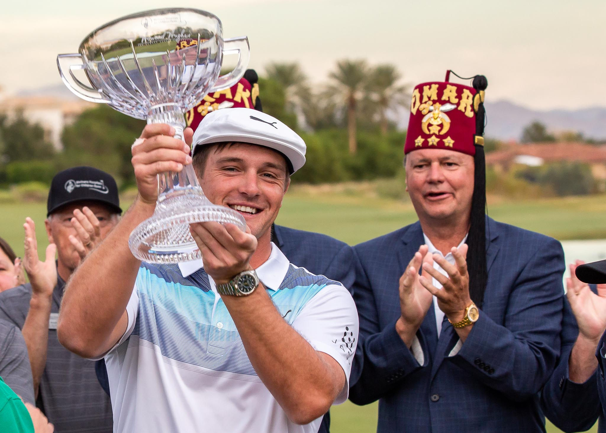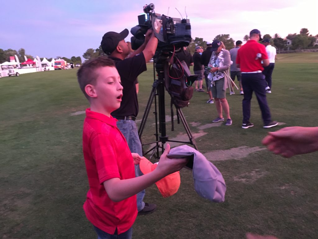 After a press conference, DeChambeau walked out to a gorgeous sunset that served as a backdrop for more photos. Before the photo session, however, he found time to autograph one of his signature hats for a young fan.