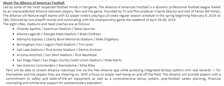 But he said this league’s business model will succeed because it’s a single-entity business model where players on the 52-player rosters will each be paid three-year, $250,000 salaries paid out by $70,000 for year one, $80,000 for year two and $100,000 for year three. That’s just for starters. Players’ spouses and dependents will also receive health benefits, while players will receive free housing and access to a financial literacy program. In fact, the alliance’s business model, Ebersol said, was built from the models of tech start-ups, where several hundred million dollars of funding from venture capitalists and high-worth investors are launching the Alliance of American Football.