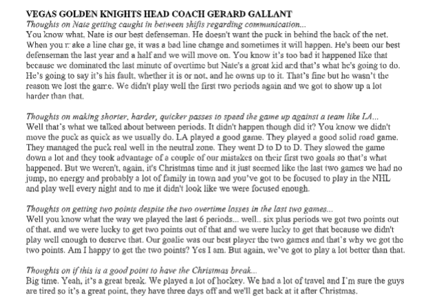 And here’s Golden Knights coach Gerard Gallant’s quotes after the game.