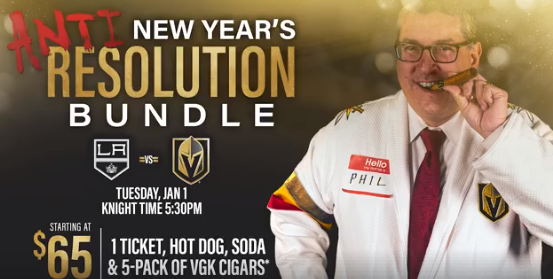 The Vegas Golden Knights are selling tickets at a rather impressive rate, but the second-year NHL expansion is rolling out a New Year’s Day ticket deal that involves an “anti-resolution” theme, VGK-branded cigars and some dude named “Phil.”