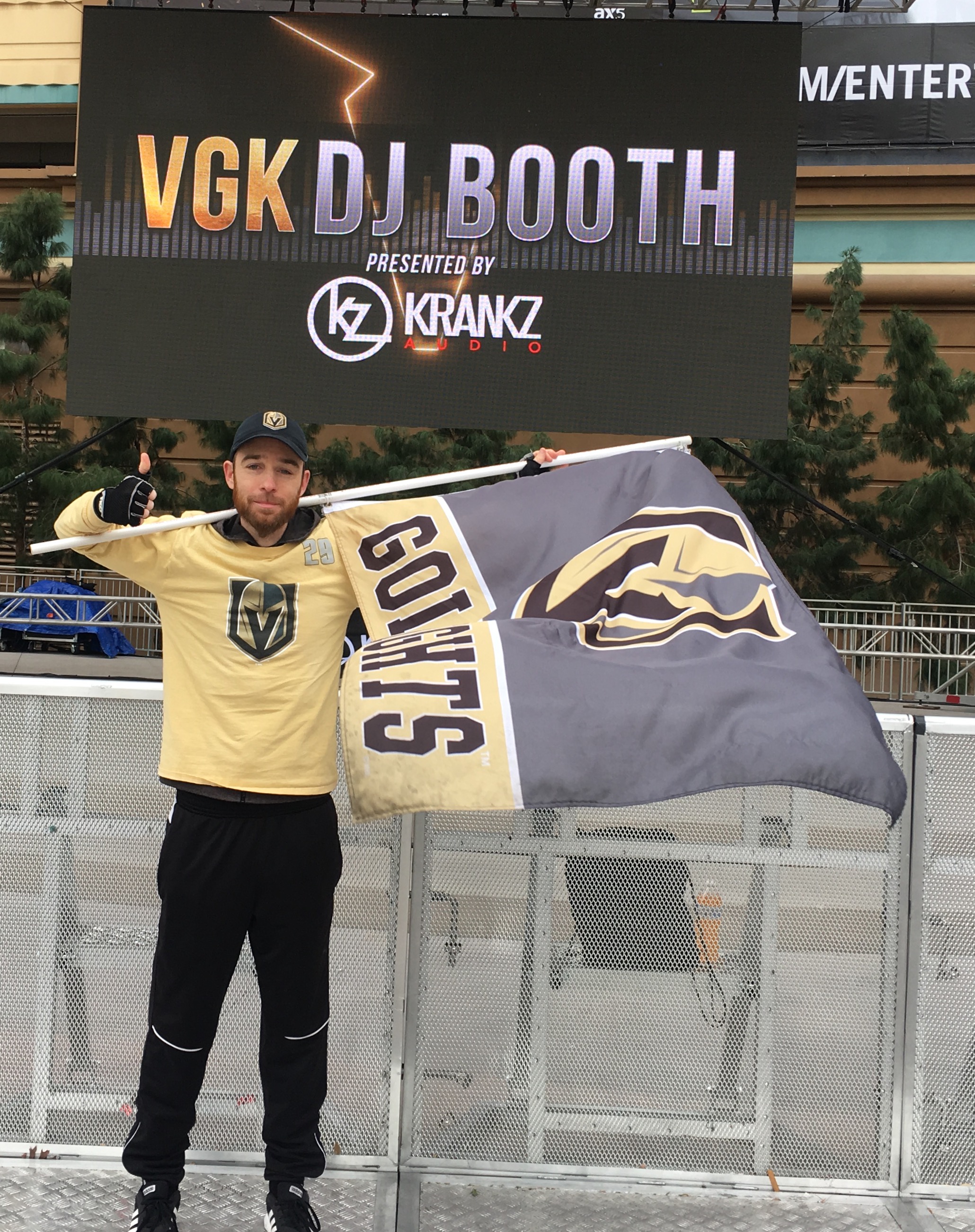 And a superfan who doesn’t have a super costume but a super prop is Matt Helfst, a 33-year-old Las Vegan who brings his trusty Golden Knights flag to every VGK home game and waves it in front of the outdoor screen that shows the VGK home hockey games outside the arena on the plaza.