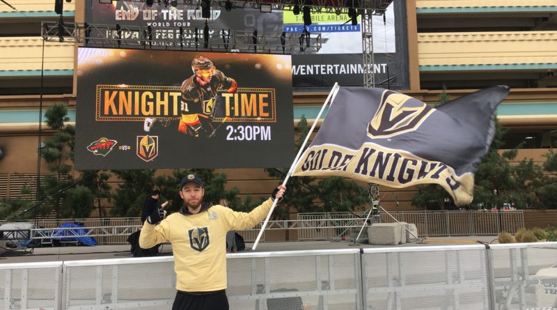 While 18,000 plus fans pile into the Big Ice House on the Strip, Helfst stays outside with his gold and black Golden Knights flag — a major accomplishment Monday for a 3 p.m. Golden Knights-Minnesota Wild game when strong winds were whipping Helfst’s beloved flag.