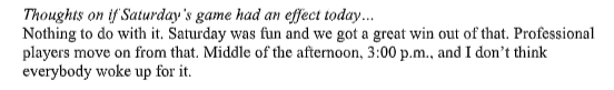 Coach Gerard Gallant was disappointed with the team’s effort and said the squad didn’t appear ready to play for the 3 p.m. start Monday. Gallant’s post-game press conference lasted two minutes and 30 seconds. He’s not too chatty after losses.