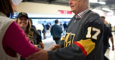 The D hotel-casino owner Derek Stevens, a big Golden Knights fan and sponsor, gave a $100,000 check before the game to the Golden Knights Foundation for the Lil’ Knights youth hockey program.