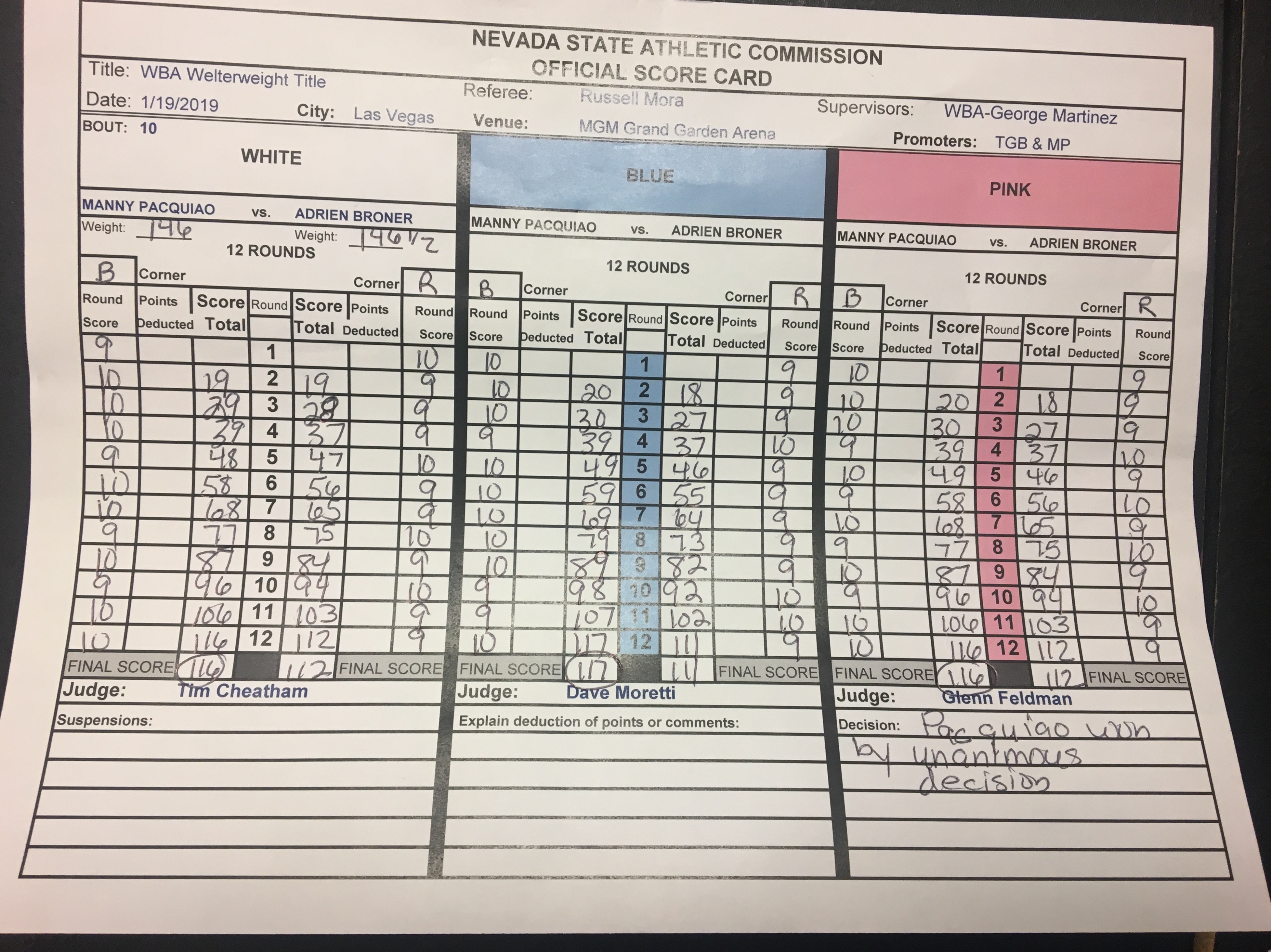 Saturday, the 40-year-old eight-division champ, Pacquiao, controlled each round and easily cruised to a unanimous decision over the 29-year-old Broner. The humble champ spent most of the week quoting the biblical passages Jeremiah 9:23-24 about not being boastful. That’s about right for a guy who began boxing to earn a $2 prize to help his mother feed the family.