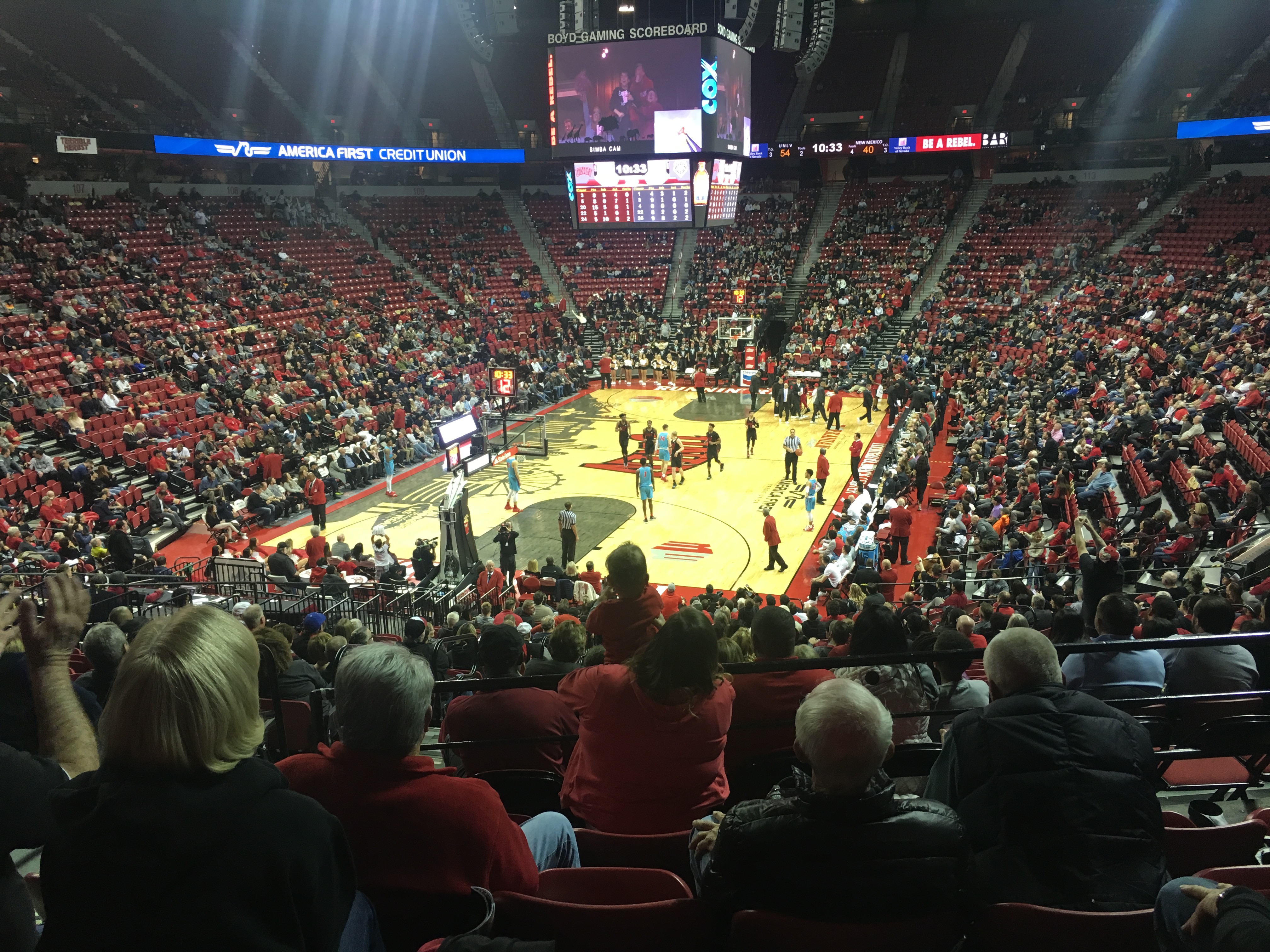 You get the sense the small crowds at UNLV basketball games may have bottomed out this season as a group of fans that numbered in the 4,000-5,000 range (according to what an usher said she was told) was a lively bunch and cheered on another Runnin’ Rebels conference win Tuesday night.