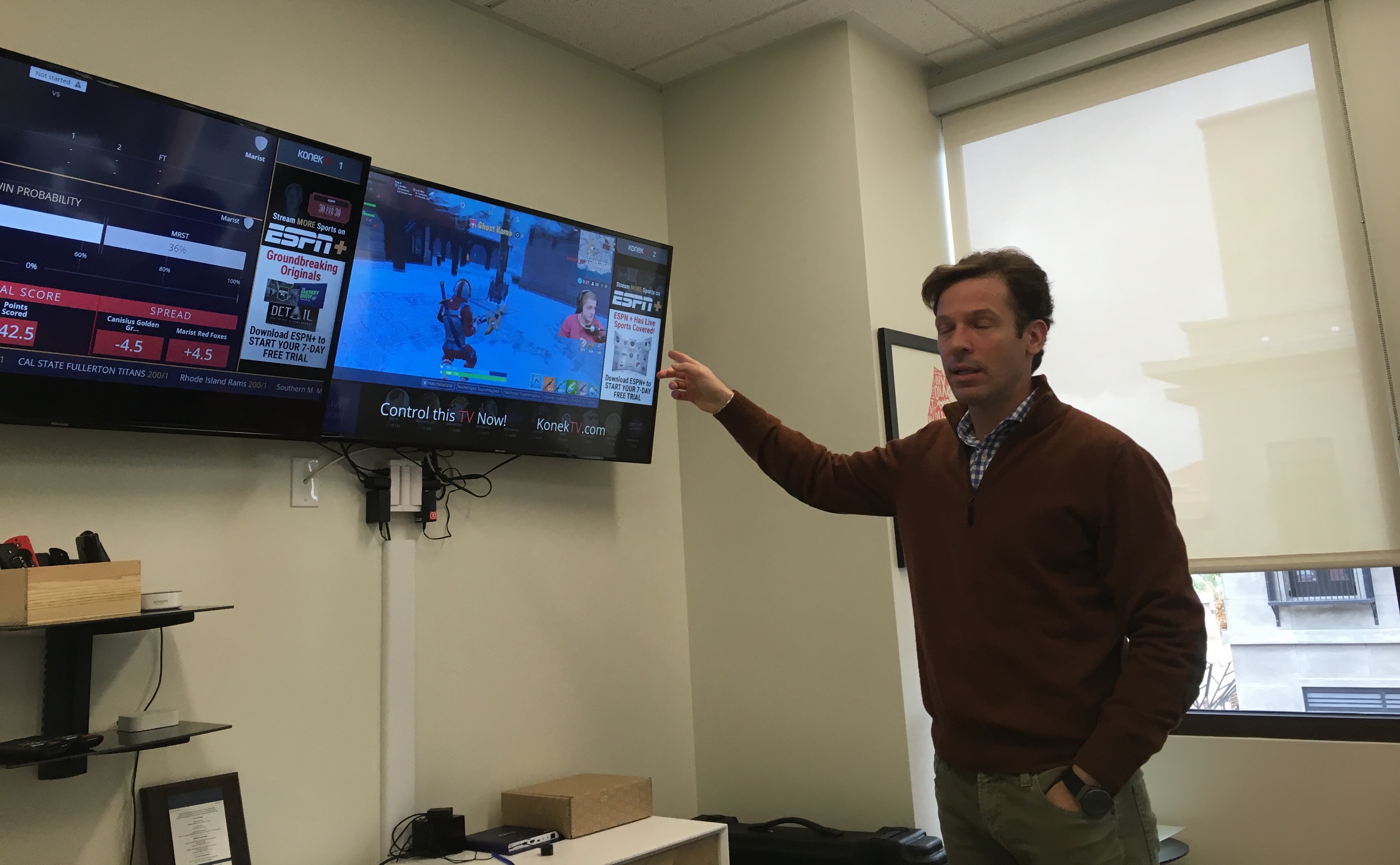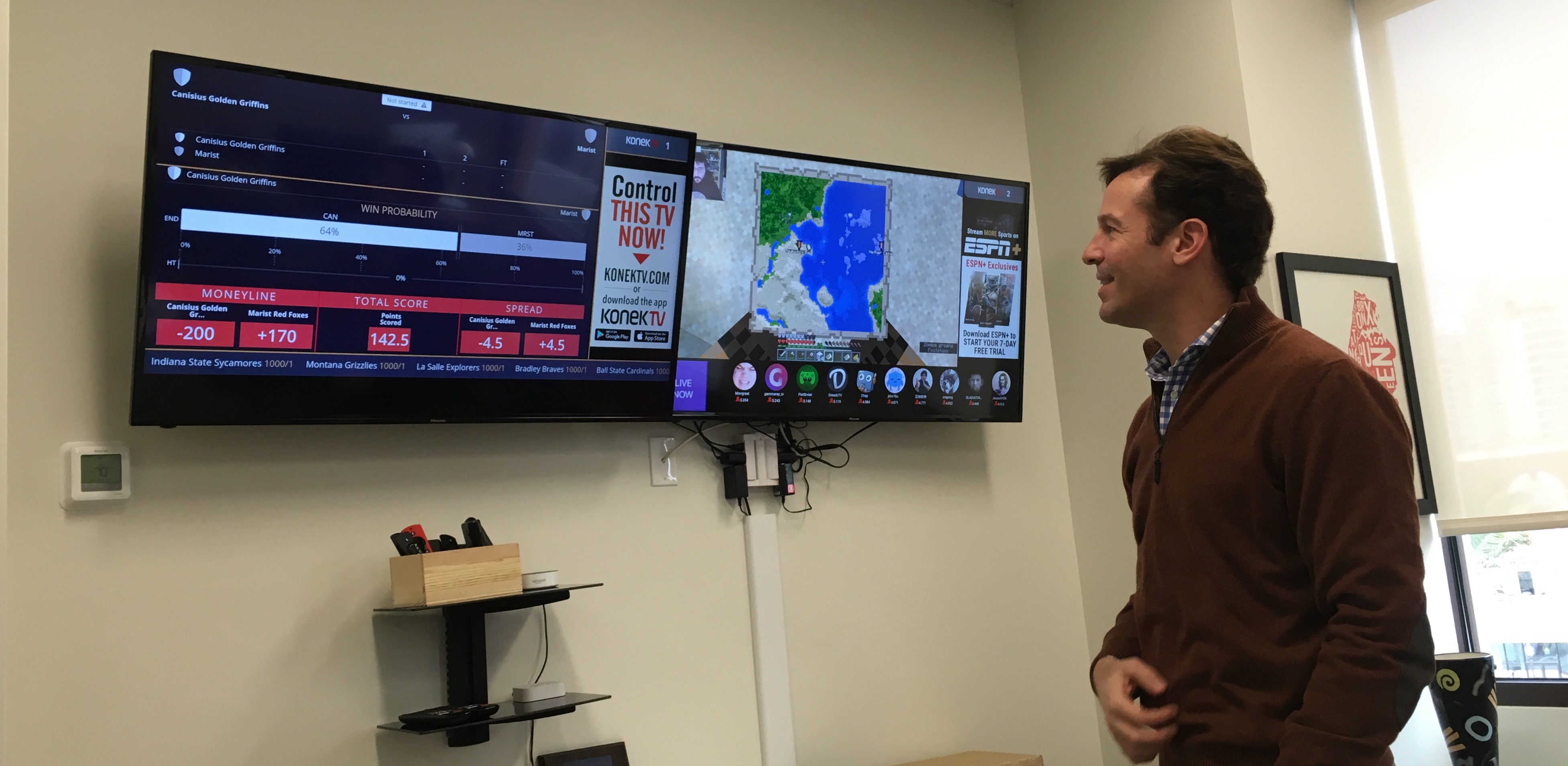 That’s why KonekTV wants to not only stream esports competitions like the popular Fortnite game but also supply real-time betting odds and data along with stats on the two teams. On Monday morning at their office, they called up today’s scheduled Louisville vs Virginia Tech college basketball game, for example, and showed the money line, and team stats via their streaming that would allow fans watching the game later today to place bets via an app during the game.